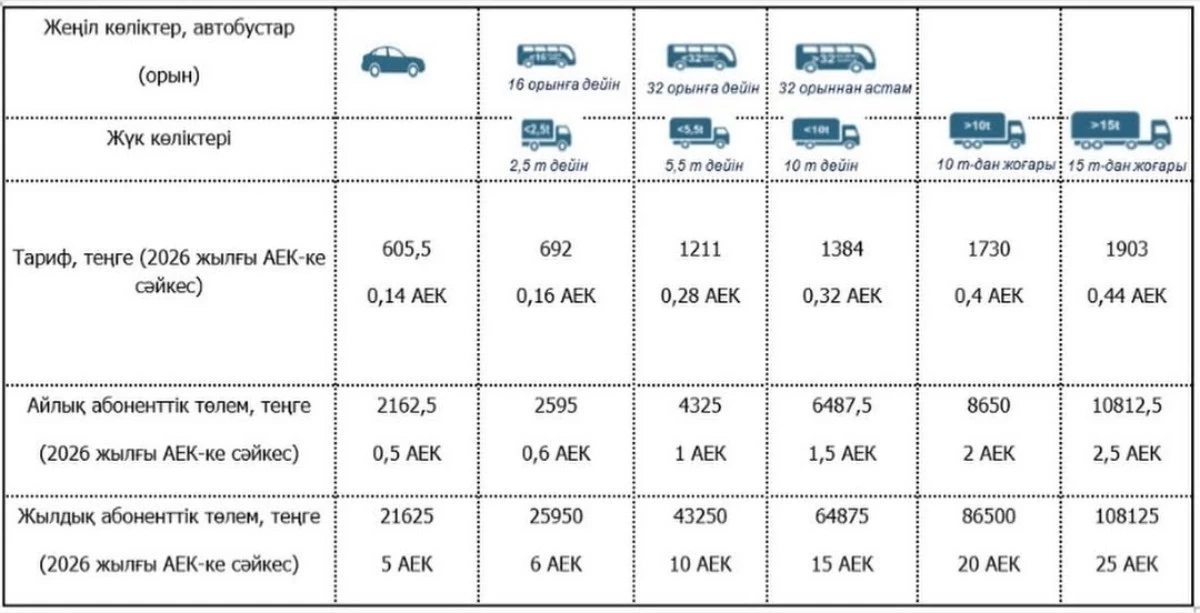 Айта кетейік, жаңа тариф 2026 жылдың 1 қаңтарынан бастап күшіне енетін жаңа айлық есептік көрсеткіш (1 АЕК – 4 325 теңге) бойынша есептелген.