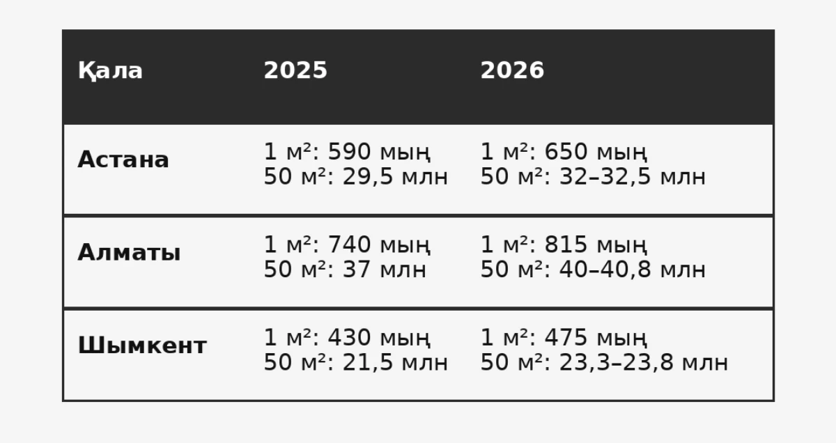 Демек, 2026 жылы эконом-класс жаңа тұрғын үйі Алматыда 40 миллион теңгеден асады, Астанада 32 миллион теңгеге жуықтайды, ал Шымкентте 23–24 млиллион теңге аралығында болады деген сөз.