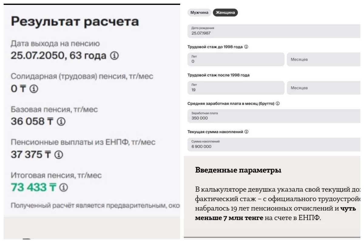 Қазақстандық қаржыгер 38 жастағы, 19 жылдық еңбек өтілі бар, ай сайын 350 000 теңге табатын әйелге жасалған нақты есепті жариялады. Бірыңғай жинақтаушы зейнетақы қорында 7 миллион теңге жинағанына қарамастан, зейнеткерлік есептегіш 2050 жылға қарай оның ай сайынғы төлемін бар болғаны 73 433 теңге деп көрсеткен. Бұл туралы Stan.kz ақпарат агенттігі хабарлайды.