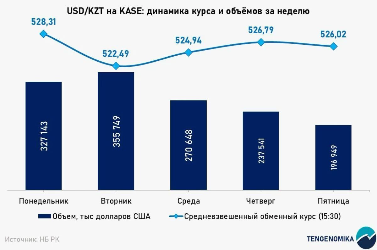 Апта бойы теңге айтарлықтай нығайды. Долларға қатысты ең төменгі көрсеткіш 4 қараша күні тіркеліп, 1 доллар – 522,5 теңге болды. Ең жоғарғы көрсеткіш 3 қарашада тіркелді. Ол кезде көрсеткіш – 528,3 теңге болды. Апталық ауытқу диапазоны 5,8 теңге. Апта бойынша орташа айырбас бағамы 525,7 теңге деңгейінде тұрақтады. Бұл ұлттық валютаның пайдасына қарай тепе-теңдік болмағанын көрсетеді.