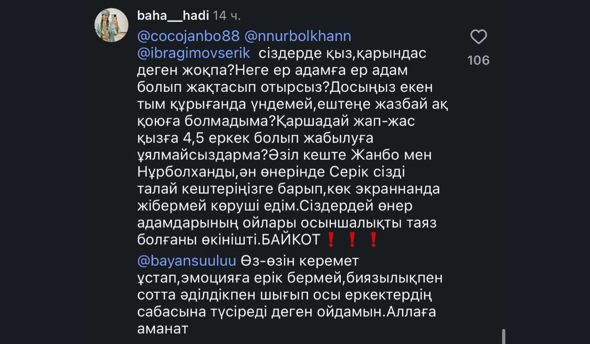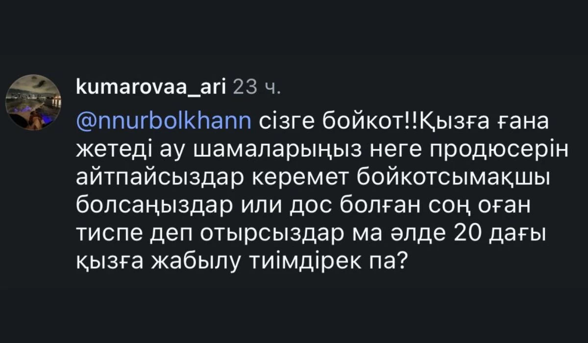 “Ұят-ай, қазақ халқының білдей бір әншілері масқара. Сендерге бойкот! Сендердің шаруаларың қанша? Қолдасаң үндемей қолдап, отыра беріңдерші! Жол көрсету деген сол ма ағайын?! Бұдан былай қазақтың қыздары деп қорғамай-ақ қойыңдаршы. Қорғау қолдарыңнан келмейді. Қолдасаң екеуі де қазақ, “Бауырлар, бір сыпайы түрде мәмілеге келіңдер” деп қолдаудың орнына хит болып көтеріліп кеткен соң көре алмай отыр. Әйтпесе, білдей бір қазақ халқының алдына шығып, өнер көрсетіп жүрген сіздер секілді адамдарға жараса ма? Нұрболхан, Жанболат, Серік мырзалар?” – деп жазды ол.