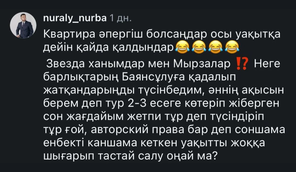“Серік, Жанболат, Нұрболат, Бағлан мырзалар мен Баян ханым, осыншама осыншама аудиториялырыңыз бола тұра, істің анық-қанығына бармай жас әншіні ел алдында төмендеткендеріңіз қате! Продюсер ортақ таныс әрі еркек болғасын ғана сөз айта алмай Баянсұлуға ғана әңгіме айтып отыр. Келісімшартқа отырмаған өзі, гонорарын да келіспеген өзі. Осы уақытқа дейін өзі айтқандай атақты әншілермен жұмыс жасаған болса, сол уақытта неге жасап алмады жағдайын? Продюсер кеткенге дейін неге сұрамады ақшасын? Ән әлемге танымал болғасын ғана отбасы жағдайын тықпалап мынадай әңгіме айтуы ерсі екен! Неге ақша жөніндегі мәселе, жалпы видео неге бұрынғы продюсеріне арналмаған?” – деп жазды ол.