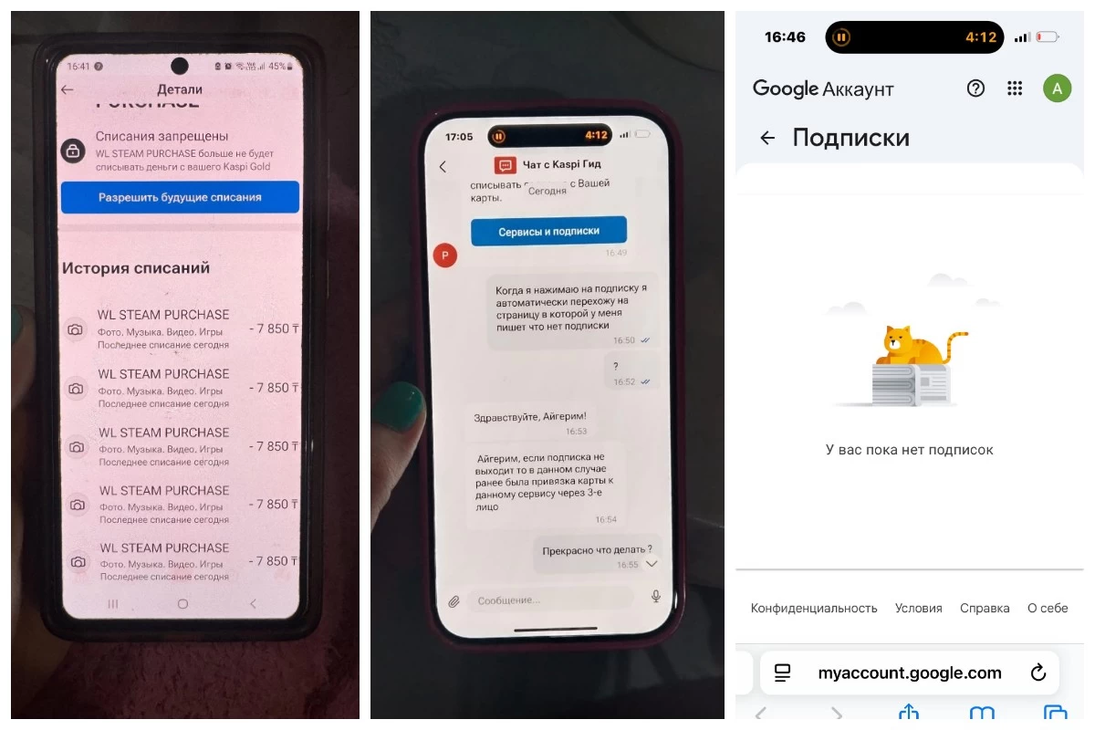 “1 желтоқсан күні әпкемнің Kaspi шотынан 50 000 теңге шешіп алды. Олар әр минут сайын 10 000 теңгеден алып отырды. Әпкемнің Steam-да аккаунты жоқ, ойнамайды және картасын ешкімге бермеген. Kaspi-ден жазылымдарын тексердік, ол жерден белсендірмеген аккаунты бар екенін байқадық. Демек сервис жазылымды “жасырын” немесе “автоматты түрде” қосқан болуы мүмкін. Мен де, картамды тексеріп көрдім. Өзімнен де жазылымды байқадым. Оны тіпті жоя алмадым. Kaspi оны үшінші тарап белсендірген болуы мүмкін дейді”, – деп жазды ол.