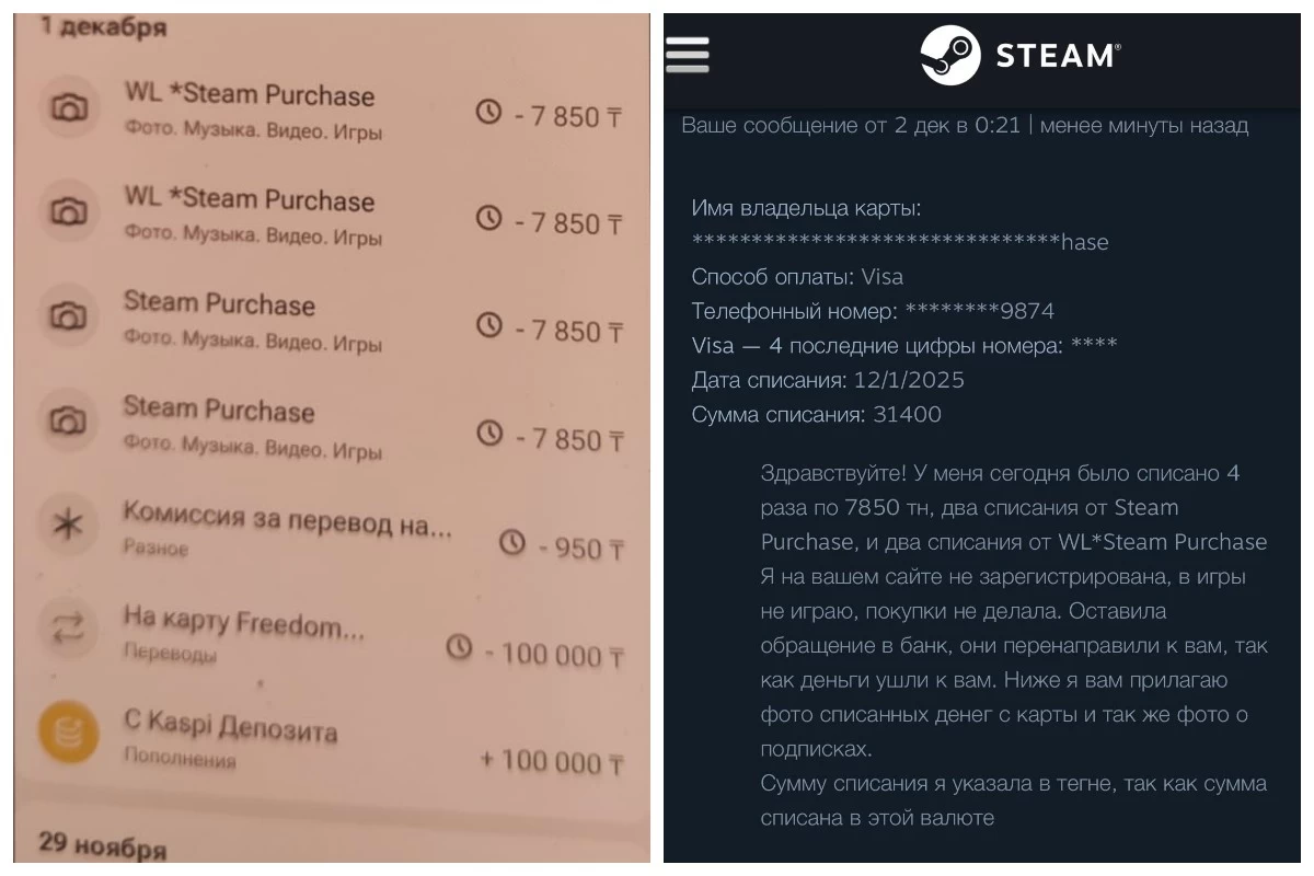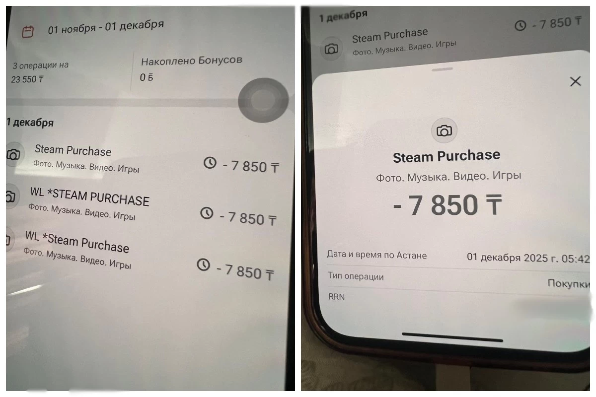 “Kaspi картамнан түсініксіз төлем алынды. Түстен кейін Kaspi-ге өтініш қалдырдым, бірақ менеджер төлемді алған Steam сайтына жүгіну керек деді. Содан кейін Steam-ге кіріп, “белгісіз сатып алу” бөлімі арқылы өтініш қалдырдым. Барлық скриншоттарды яғни Kaspi-ден алынған төлемдер мен жазылымдар бойынша ақпаратты қоса жібердім. Шамамен бір сағаттан кейін ақша толық көлемде қайтарылды. Steam оны “сатып алу тоқтатылды” деп қайтарып жіберді. Бірақ ең қорқыныштысы қазір адамдардан жаппай ақша шешіліп жатыр. Ал Kaspi жағдайды нақты түсіндірме бермей, “бізге қатысы жоқ” деген позицияны берік ұстанып отыр”, – дейді желі қолданушысы.