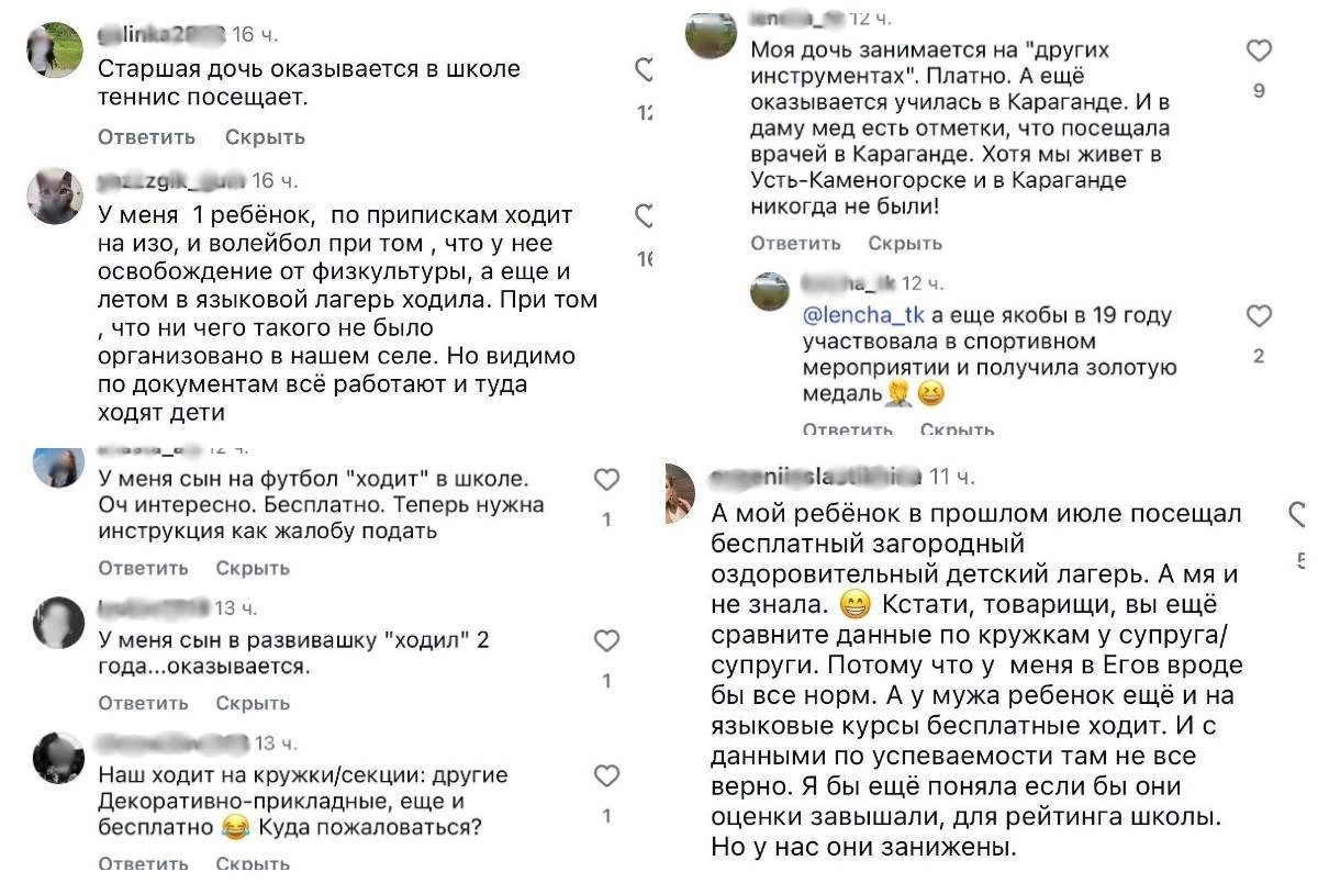 “Жүйе бойынша балаи бейнелеу өнері мен волейбол үйірмесіне қатысады екен. Бірақ оның дене шынықтырудан босату туралы анықтамасы бар. Тағы жазда тілдік лагерьге барған болып шықты. Ал біздің ауылда ондай лагерь мүлде ұйымдастырылған жоқ. Бірақ құжат бойынша бәрі жұмыс істеп, балалар барып жүргендей көрсетілген”,