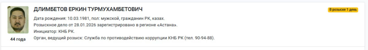 Бас прокуратураның Құқықтық статистика және арнайы есепке алу комитетінің мәліметінше, іздестіру карточкасына сай, Еркін Длімбетовке қатысты іздестіру ісі 28 қаңтарда Астана қаласында тіркелген.