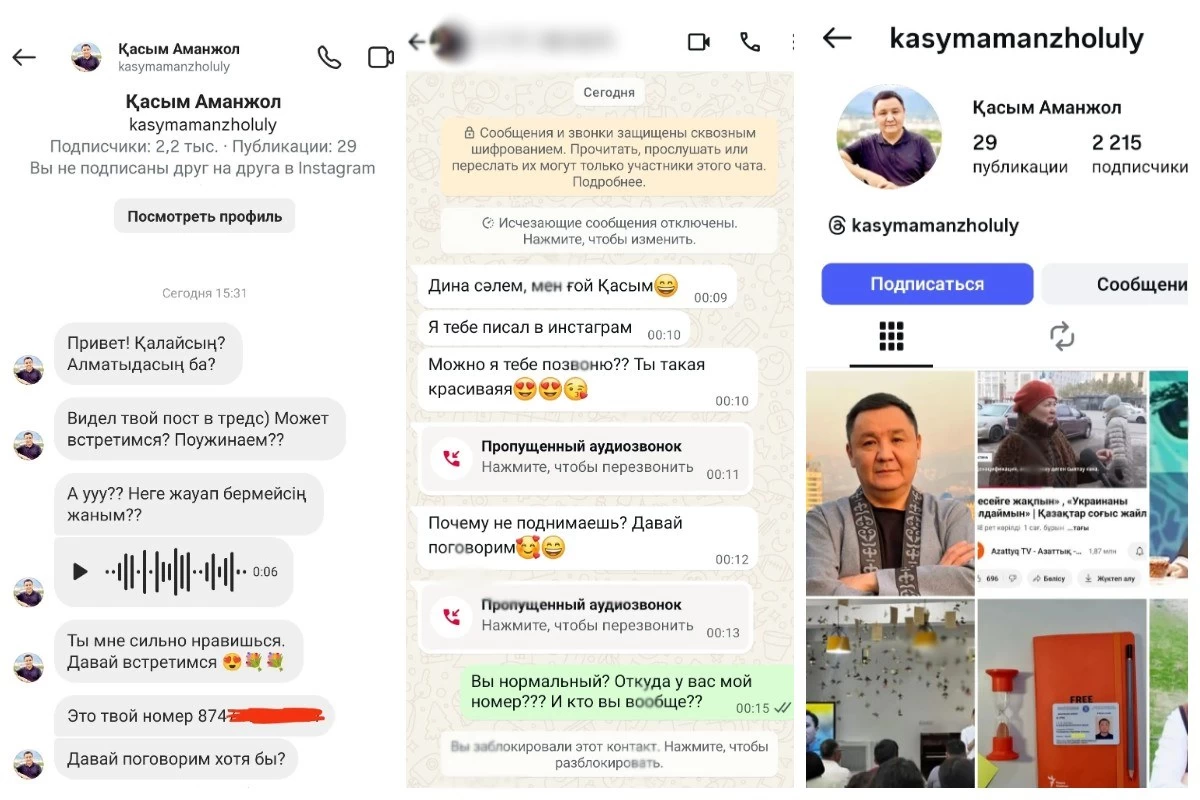 "Достар, мені біреу аңдып жүр. Ересек ер адам үнемі жекеме жазып, кездесуге шақыра береді. Тіпті "жаным" деп атайды. Кейін ол нөмірімді тауып алып, WhatsApp-та жазып, қоңырау шалды. Содан кейін шынымен қорқа бастадым. Айта кетейін, Instagram парақшам басқа нөмірге тіркелген. Ал бұл нөмірді санаулы адамдар ғана біледі, ашық жерде жарияланбаған. Бұл адамды мүлде танымаймын. Көмектесіңіздерші, не істеуім керек? Мүмкін оны танитындар бар шығар немесе сіздерге де жазған болар?", – деп жазды ол.