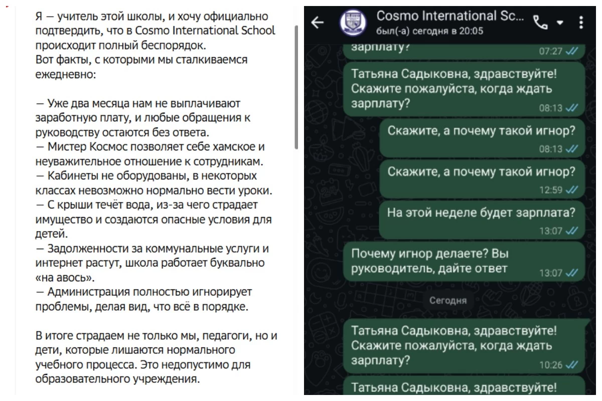 “Cosmo International School мектебінде оқитын 2 “А” сыныбы ата-аналарының айтуынша, мұғалімдерге қазан айынан бері жалақы төленбеген. Ал мұғалімдер28 қарашадан бастап жұмыстан кететіндерін хабарлаған. Соның салдарынан балалар білім алудан қалып, оқу процесі толығымен тоқтап қалуы мүмкін”, – дейді олар.