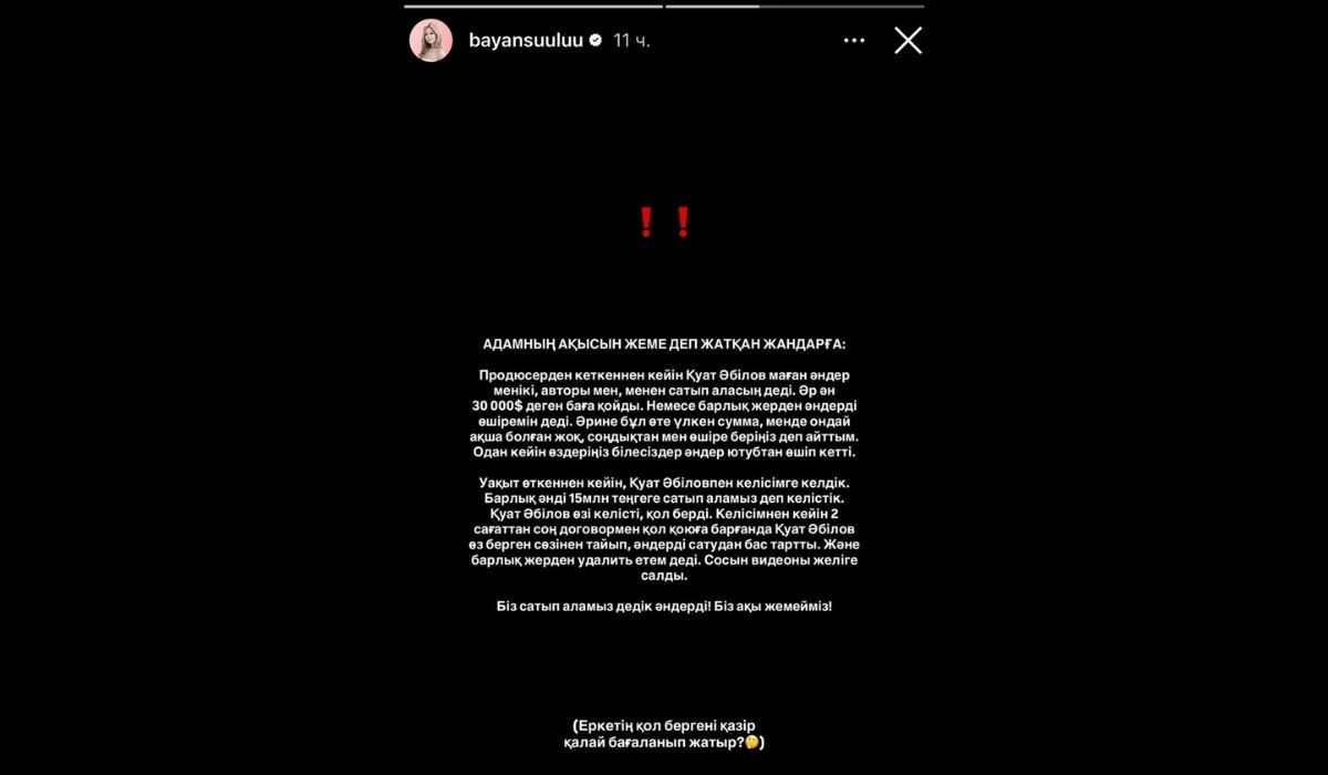 Сондай-ақ Баянсұлу екі жыл бұрын “Ұмытсам да” әнін толық сатып алғанын, бірақ ресми келісімшарт жасалмағанын айтты. Соған қарамастан, барлық төлемді растайтын чек пен жазбалар өзінде бар екенін жеткізді.