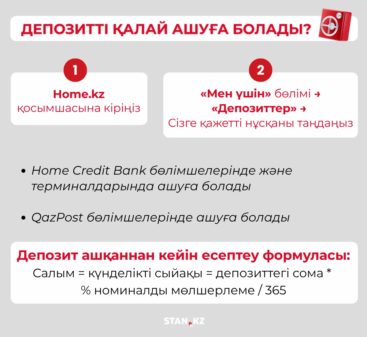 Қосымшадан бөлек, Home Credit Bank бөлімшелерінде және терминалдарында, QazPost бөлімшелерінде де ашуға болады.