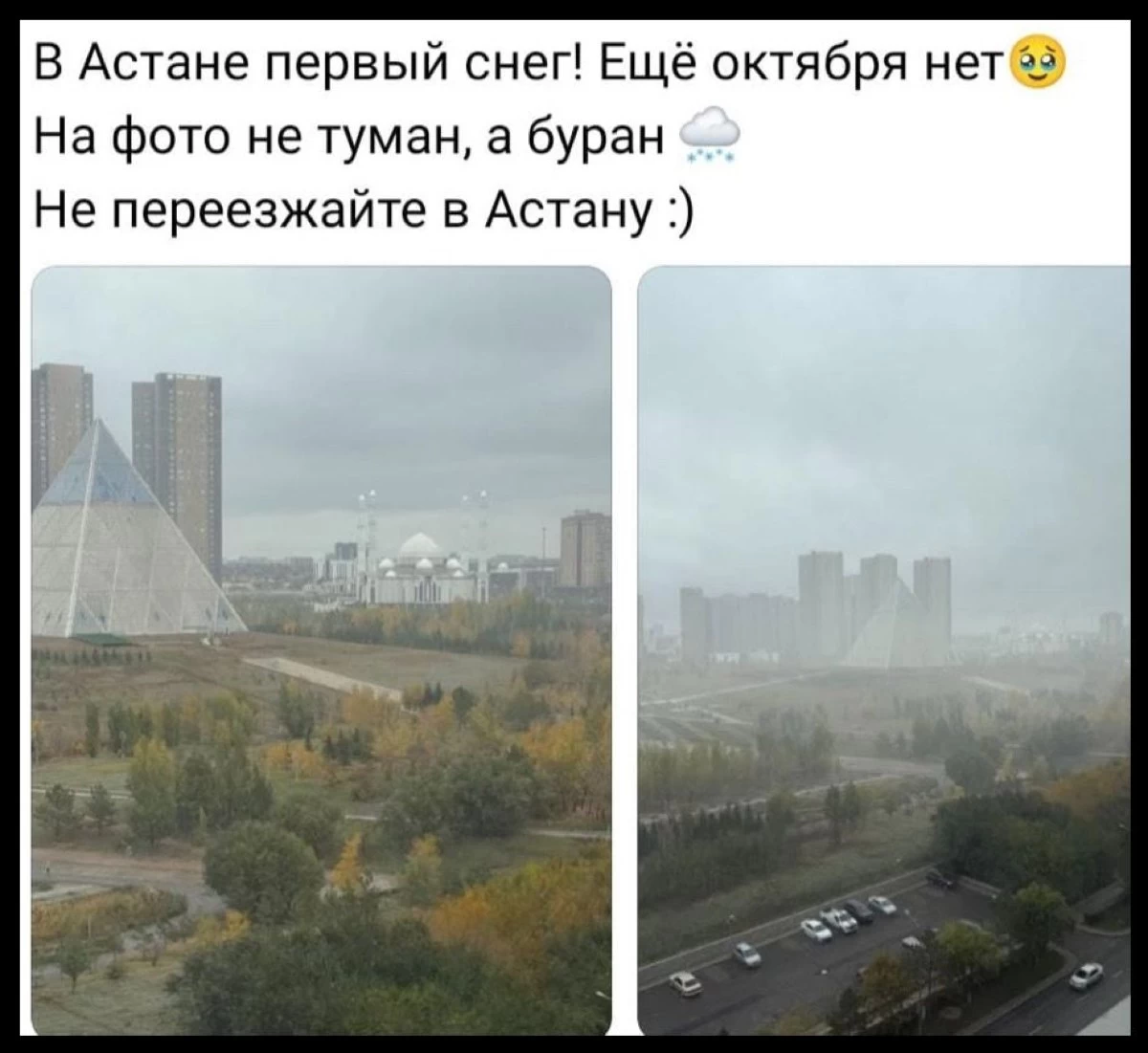 29 қыркүйекте Қазақстан астанасында алғашқы қар түсті. Ауа температурасы + 2° C-қа дейін төмендеді, ал түнде синоптиктердің болжамынша -2° C-қа дейін үсік жүреді. Бұл туралы Stan.kz ақпарат агенттігі хабарлайды.