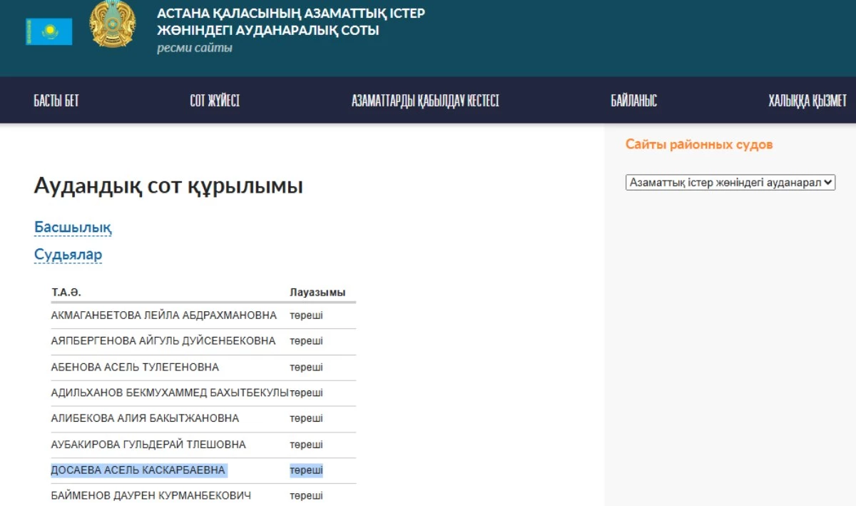 Астананың азаматтық істер жөніндегі ауданаралық сотының ресми сайтында Әсел Досаеваның судья ретінде жұмысын жалғастырып жатқаны көрсетілген.