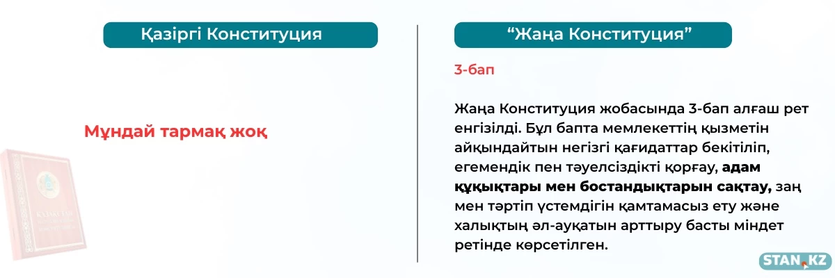 Жаңа Конституция жобасында алғаш рет 3-бап енгізілген. Онда мемлекеттің қызметін айқындайтын негізгі қағидаттар бекітіледі. Атап айтқанда: