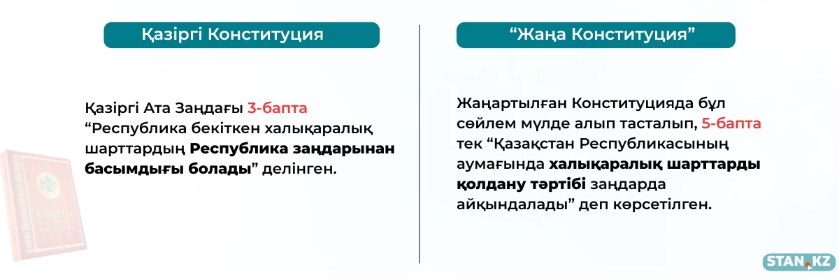 Қолданыстағы Конституцияның 3-бабында "Республика бекіткен халықаралық шарттардың Республика заңдарынан басымдығы болады" деп жазылған. Жаңа Конституцияда бұл норма толық алып тасталып, 5-бапта тек "Қазақстан Республикасының аумағында халықаралық шарттарды қолдану тәртібі заңдарда айқындалады" деп көрсетіледі. Енді халықаралық құқықтың ішкі заңдардан басымдығын жойып, мемлекеттің егемен шешімін алдыңғы орынға қояды.