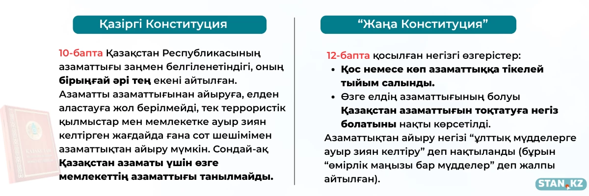 - өзге елдің азаматтығы Қазақстан азаматтығын тоқтатуға негіз болатыны нақты жазылған;