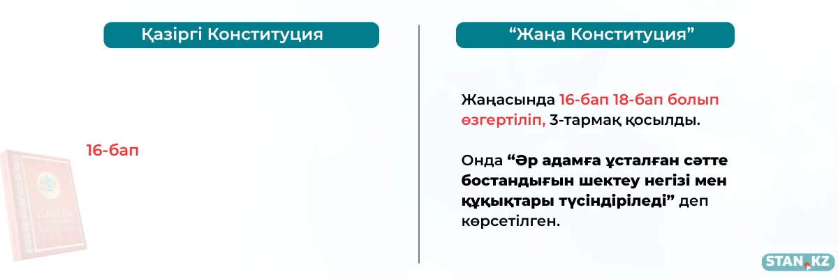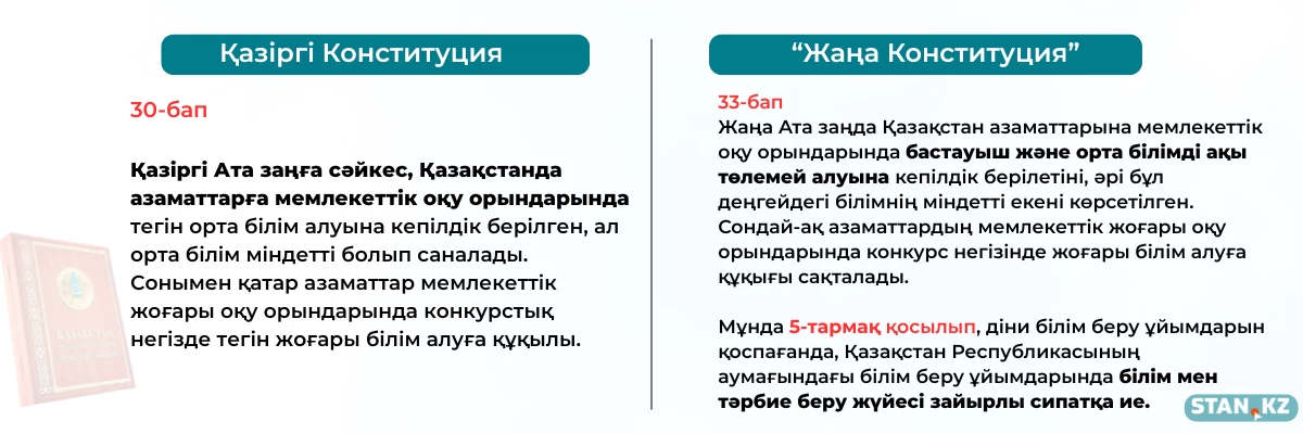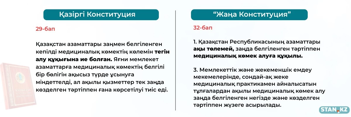 Сөз бостандығы, митинг өткізу құқығы және азаматтық алу және қазақ тілінің мәртебесі, тегін білім мен медицина секілді құқықтар жаңа Конституцияда қалай өзгереді? Ұсынылған жобада енді халықаралық құқықтың басымдық алып тасталып, президенттік билікке қатысты жаңа тетіктерді енгізуді қарастырмақ. Stan.kz тілшісі қолданыстағы Конституция мен жаңа Ата Заңды салыстырып, қай баптардың өзгергенін және оған саясаттанушылар қандай баға бергенін талдап көрді.