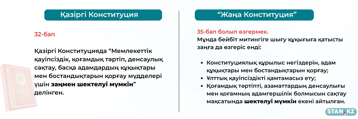 Қазіргі 32-баптағы митинг өткізу құқығы жаңа Конституцияда 35-бап болып өзгертілген. Онда митинг өткізу құқығы: