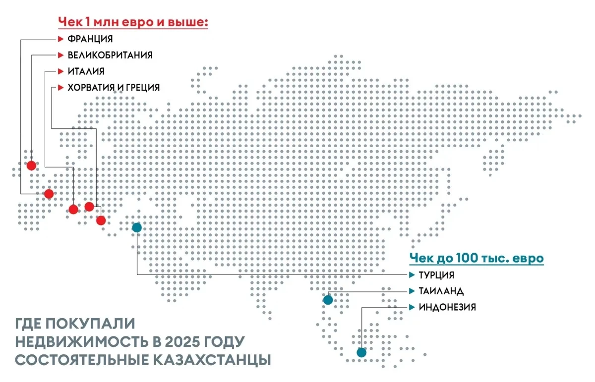 Tranio мәліметінше, 2025 жылы қазақстандық сатып алушылар (1 миллион еуродан басталатын) Еуропада ірі мәмілелер жасаған. Олар жылжымайтын мүлікті Франция, Ұлыбритания және Италиядан алған.