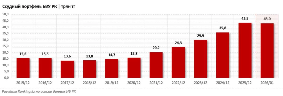 2025 жылдың соңына қарай Қазақстанның екінші деңгейлі банктерінің несие портфолиосы 21,3% өсіп, рекордтық 43,5 триллион теңгеге жетті. Ranking.kz сайтының хабарлауынша, бұл көрсеткіш бес жылда үш есеге жуық өсті.