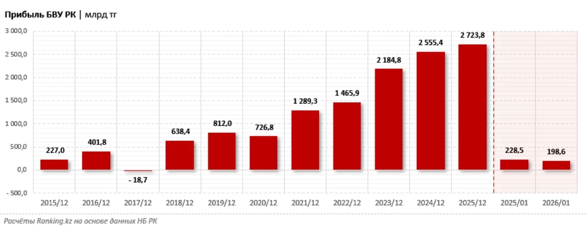2025 жылы Қазақстандағы екінші деңгейлі банктер рекордтық көлемде пайда тапты. Жалпы сектордың таза пайдасы 2,72 триллион теңгеге жетті. Бұл 2024 жылғы 2,56 триллион теңгемен салыстырғанда 6,6%-ға артқан. Көрсеткіш елдегі қаржы жүйесінің тұрақты дамуын және іскерлік белсенділіктің жоғары деңгейін айқындайды. Бұл туралы Ranking.kz агенттігі Ұлттық банк деректеріне сілтеме жасап хабарлайды.