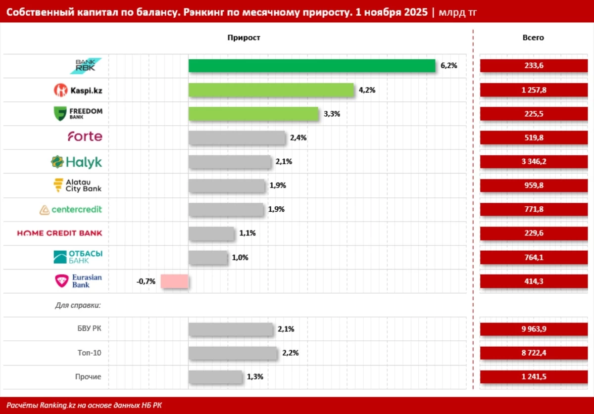 Қазақстанның екінші деңгейлі банктері арасында баланс бойынша меншікті капиталдың айлық өсімі тұрғысынан Bank RBK айқын басымдықпен көш бастап тұр. Көрсеткіш 6,2%-ға артып, 233,6 миллиард теңгеге жетті. Жыл басынан бері банк көрсеткішті 17,9%-ға арттырды. Баланс бойынша меншікті капитал қаржы институттарының қаржылық тұрақтылығын сипаттайтын маңызды көрсеткіштердің бірі. Бұл көрсеткіш активтер мен міндеттемелер арасындағы айырманы білдіреді. Баланс бойынша меншікті капиталдың динамикасына қарай банктің өз қаржылық ресурстарының жай-күйі мен қаржылық әлеуетін бағалауға болады. Бұл қаржы институты өзінің белсенді портфолиосын құру үшін пайдаланатын қаржылық ресурстар. Сонымен қатар аталған көрсеткіш банктің сенімділігі мен инвестициялық тартымдылығын айқындайды.