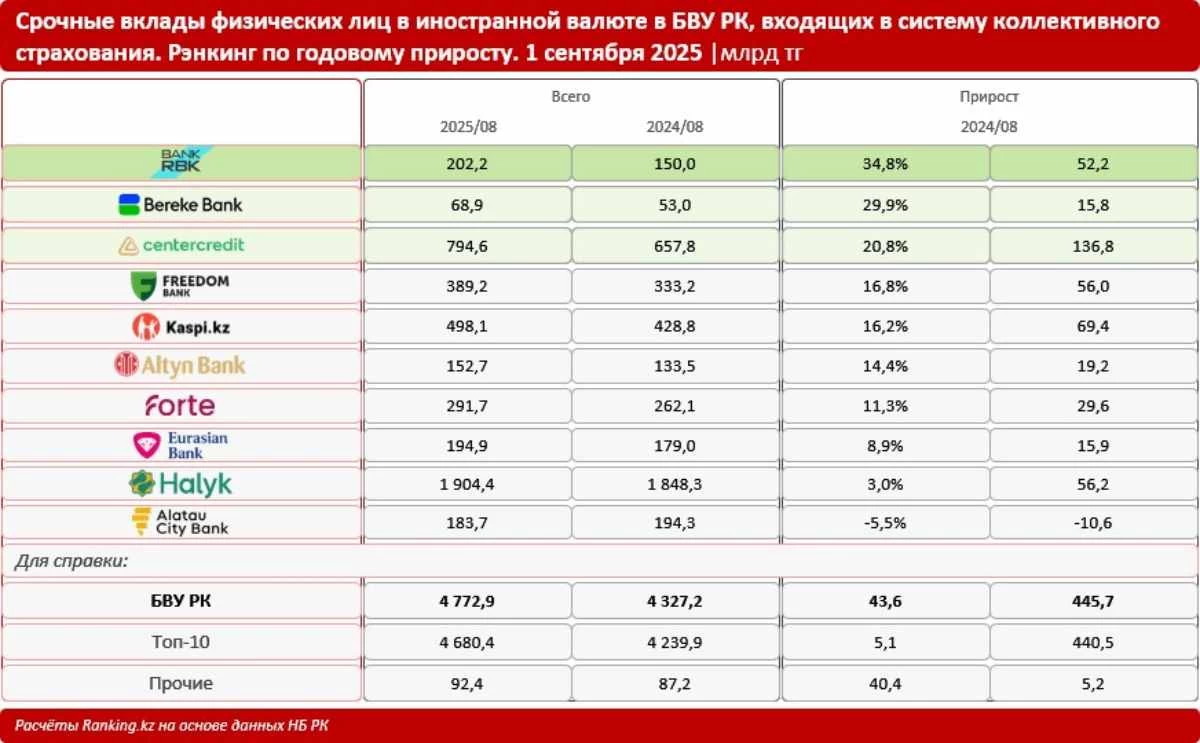Жалпы алғанда, Қазақстандағы топ-10 банк секторында шетел валютасындағы мерзімді салымдардың жиынтық көлемі 4,7 трлн теңгеге жетіп, бір жылда 10,4% өсті. Ал өзге банктердің үлесі бар болғаны 92,4 млрд теңге тиесілі (өсім – 6%).