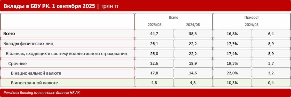 Биыл қыркүйекке қарай ұжымдық сақтандыру жүйесіне кіретін екінші деңгейлі банктердегі (ЕДБ) халық салымдарының көлемі 26 трлн теңгеге жетті. Оның ішінде 22,6 трлн теңге (өсім – 19,3%) – мерзімді салым. Шетел валютасындағы мерзімді салымдар 4,8 трлн теңгеге жетіп, бір жылда 10,3% артқан. Бұл туралы Ranking.kz агенттігі ҚР Ұлттық банкінің деректеріне сілтеме жасап хабарлайды.