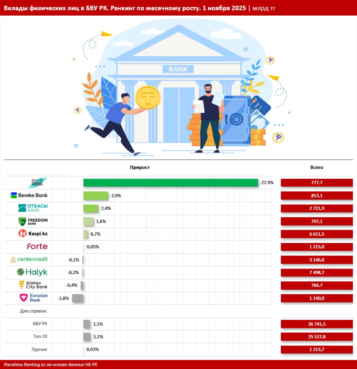 Қазақстандағы жетекші банктерде халық салымдарының жалпы көлемі 25,5 триллион теңгеге жетіп, ай ішінде 1,1%-ға өскен. Ал басқа банктерде жеке тұлғалардың депозиттері тек 1,2 триллион теңге болып, ай ішінде небәрі 0,03%-ға ғана артқан. Осылайша, Қазақстандағы 23 банктің тек 11-і айлық өсімді сақтап қалу мүмкіндігіне ие болған.