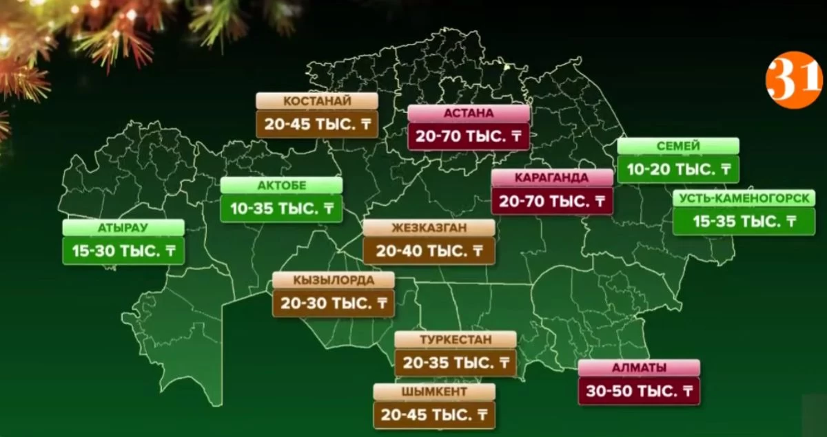 Ең жоғары баға Алматыда тіркелген. Мейрамханаларда бір адамға 30–50 мың теңге, ал премиум ұсыныстар 100 мың теңгеден асады. Ал Астанада бағалар 20–70 мың теңге аралығында. Көптеген өңірлерде корпоратив құны 20–40 мың теңге шамасында. Ал ең қолжетімді нұсқалар Семей мен Ақтөбеде тіркелген. Мұнда баға бір адамға 10 мың теңгеден басталады.