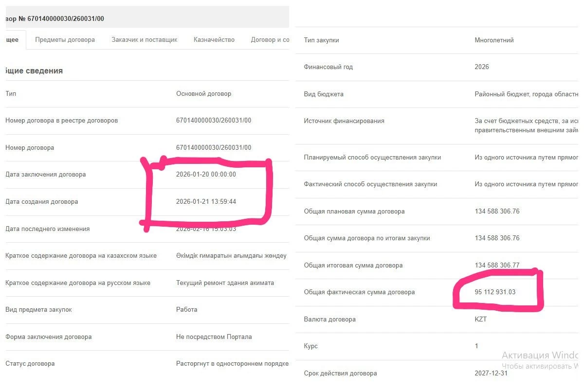 Шарт жеке кәсіпкермен жасалған. Бұл кәсіпкер мемлекеттік сатып алу порталында шарт жасалған күні тіркелген. Тіпті құрылыс жұмыстары үшін қажетті кәсіпкер немесе компания қандай қызмет түрімен айналысатынын ресми түрде көрсетуге арналған сандық кодтар жеке кәсіпкерге шартқа қол қойылғанға бір апта қалғанда қосылған. Ең таңқаларлығы – жұмыс актісі бір апта ішінде рәсімделген. Яғни, ғимаратты бір аптада жөндеуге үлгерген деген сөз.