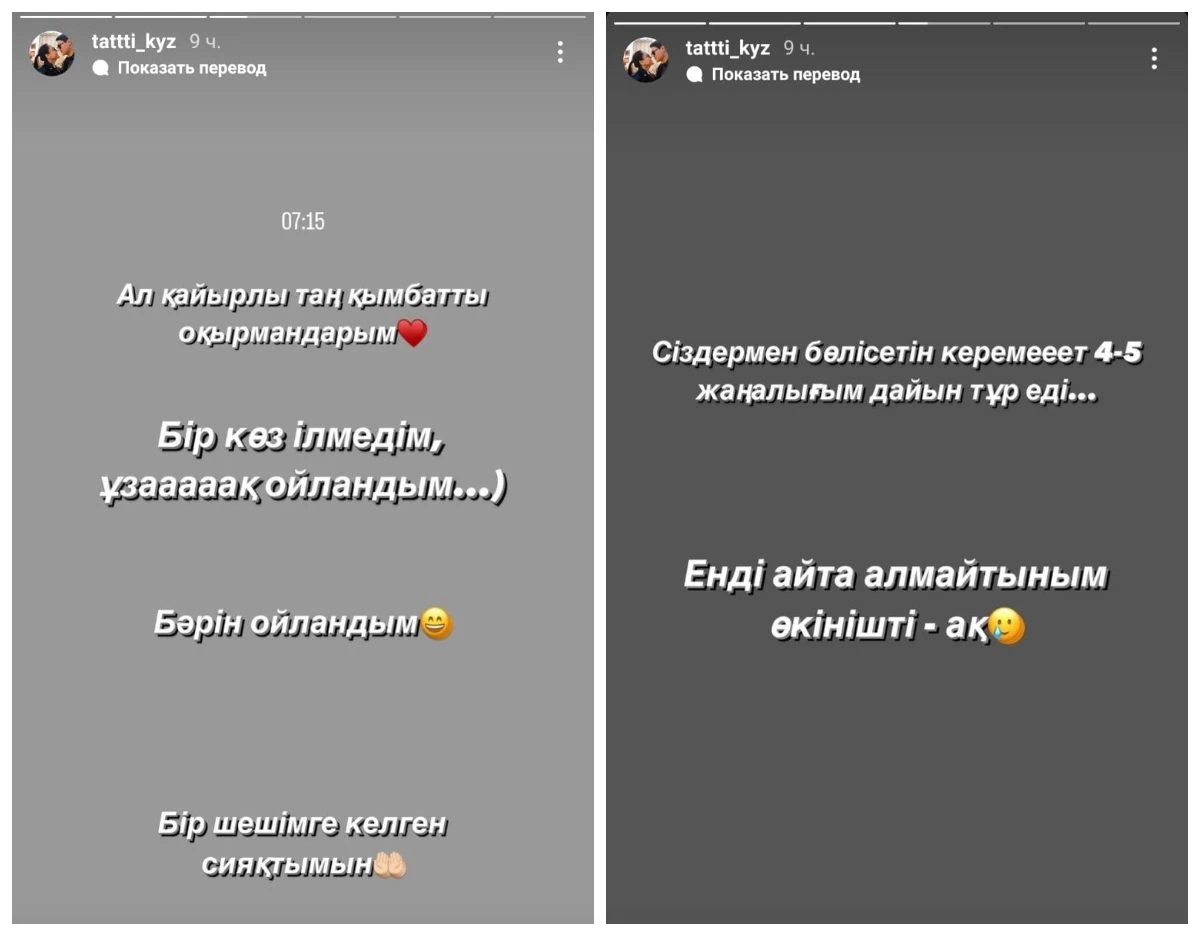 “Біз көз ілмедім, ұзақ ойландым. Бір шешімге келген сияқтымын. Сіздермен бөлісетін 4-5 жаңалығым дайын тұр еді. Енді айта алмайтыным өкінішті-ақ. Үлкен бір нәрсе жұдырықтай, кішкентай нәзік жүрегіме сыймай тұр”, – деп жазды Дина.