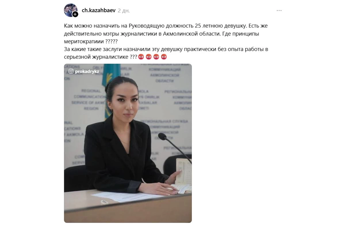 “25 жастағы қызды басшылық қызметке қалай тағайындауға болады? Ақмола облысында журналистиканың нағыз майталмандары бар ғой. Меритократия қағидалары қайда? Бұл қызды байыпты журналистикада айтарлықтай тәжірибесі жоқ болса да, қандай еңбегі үшін тағайындаған?” – деп жазды ол.