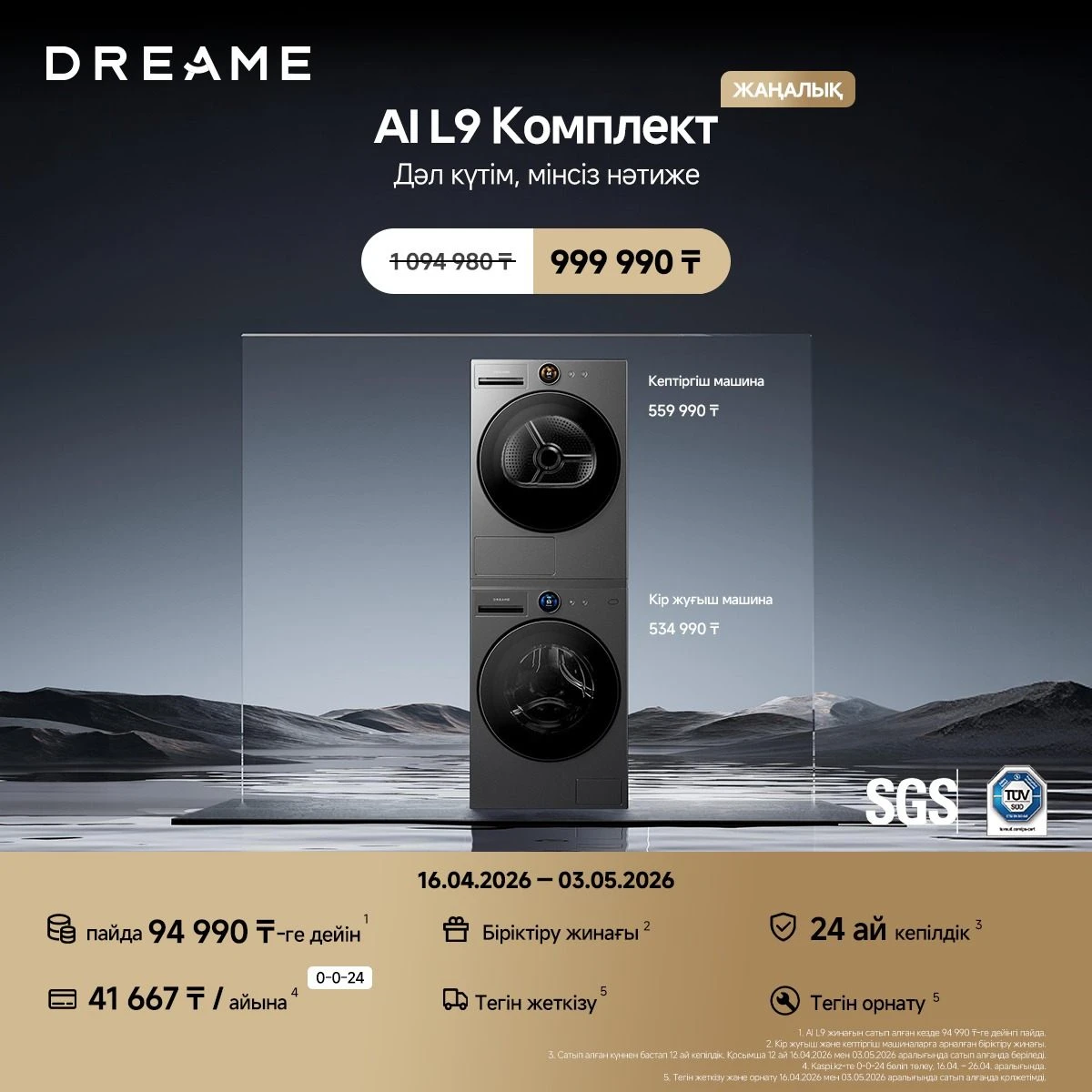 Сондай-ақ Dreame AI L9 жинағын арнайы 999 990 теңгеге алуға болады. Осылайша 94 990 теңгеге дейін үнемдейсіз.