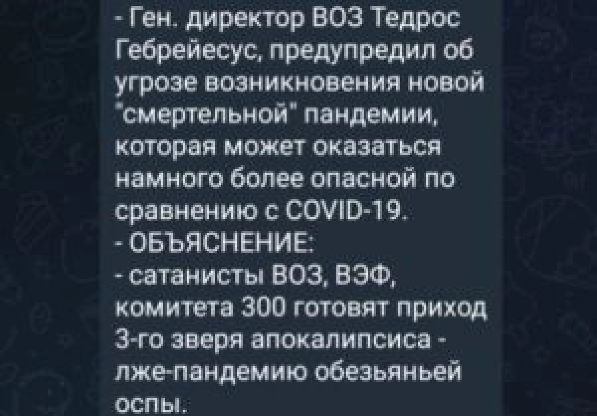 Желіде Дүниежүзілік денсаулық сақтау ұйымы COVID-19-дан да толқыны өте ауыр болатын пандемия дайындап жатқаны туралы ақпарат тараған. Тіпті деректе бұл “маймыл шешегі” болатыны түсіндіріліпті. Хабарлама авторының айтуынша, ауру әлдеқайда қауіпті, әрі адамдар бұған қырағы болуы керек.