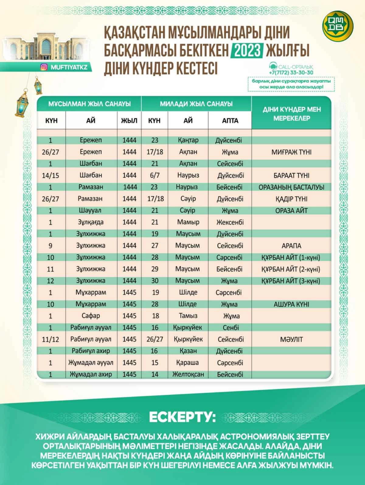 Діни басқарма 2023 жылға арналған діни күндер кестесін жариялады
