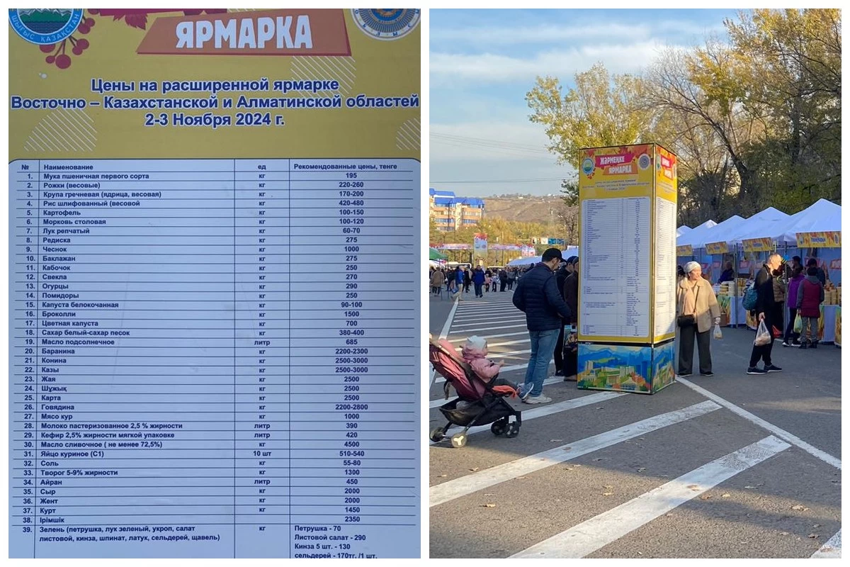 Ең қолайлысы – ортада жәрмеңкеде сатылатын барлық өнім мен олардың орташа бағалары жазылған. Өнім ассортименті – 50.