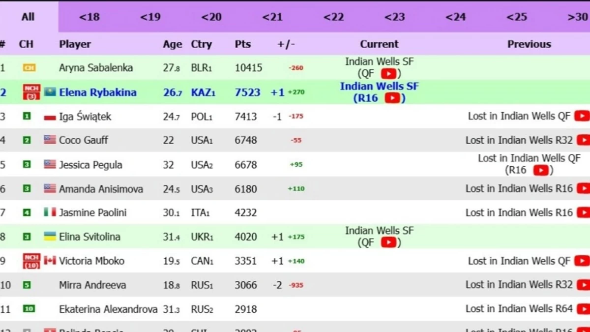 Отандасымыз АҚШ-тағы Индиан-Уэллс турнирінің жартылай финалына шыққаннан кейін әлемнің екінші ракеткасы атанды. Турнирде ол америкалық Джессика Пегулаға (5-орын) қарсы ойнап, 6:1, 7:6 есебімен жеңіске жетті. Ал екінші орын алған поляк Ига Швентек украиналық Элина Свитолина (9-орын) қарсы тұра алмай, жеңіліс тапты.