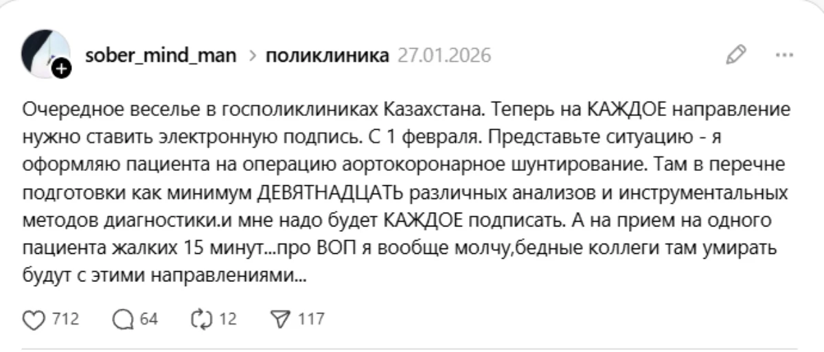 “Қазақстандағы мемлекеттік емханаларда тағы бір “реформа” медицина қызметкерлерінің жүйкесін сынағалы тұр. Енді әрбір жолдамаға міндетті түрде электрондық цифрлық қолтаңба қою қажет. Бұл талап 1 ақпаннан бастап күшіне енеді. Мәселен, дәрігер пациентті аортокоронарлық шунттау операциясына дайындап жатыр делік. Мұндай жағдайда дайындық тізімінде кемінде 19 түрлі талдау мен аспаптық зерттеу бар. Әрбір талдау мен тексеруге жеке-жеке жолдама рәсімделеді. Ал жаңа талап бойынша, солардың әрқайсысына электрондық цифрлық қолтаңба қойылуы керек. Бір пациентке бар болғаны 15 минут қабылдау уақыты берілетінін ескерсек, бұл талаптың іс жүзінде қалай орындалатыны қызық”, – деп жазды желі қолданушысы.