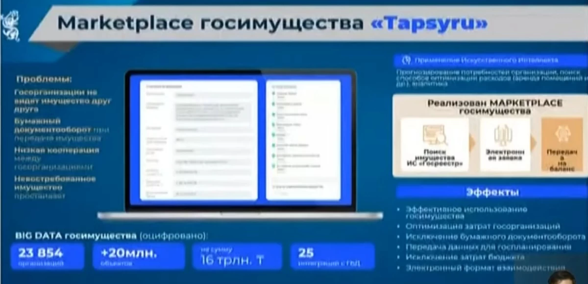 “Елде мемлекеттік мүлік өте көп. Кей органдар кейбір нысандардың бар екенін де білмейтін. Сондықтан барлық мүлік цифрландырылды. Енді бюджетті жоспарлағанда жаңа ғимарат сатып алудың қажеті жоқ, мекемелер бар мүлікті пайдалана алады. Мысалы, бұрын көлік керек болса бюджеттік өтінім жасап, ақша сұрайтын. Ал қазір маркетплейс арқылы басқа органдағы аукционға қойылған көлікті тауып, оны өз балансына тіркей алады”, – дейді Қаржы вице-министрі Әсет Тұрысов.