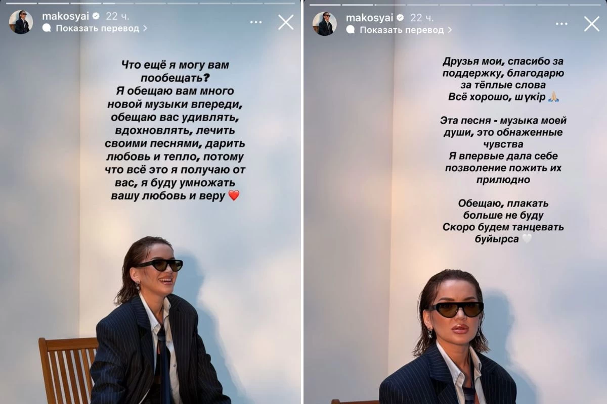 “Жылы сөздеріңіз үшін рақмет, бәрі жақсы, шүкір. Бұл ән – жанымның әуені, ішкі сезімімнің ашық көрінісі. Мен алғаш рет бұл сезімдерді көпшілік алдында сезінуге өзіме рұқсат бердім. Енді жыламаймын деп уәде беремін. Жақында бірге билейтін боламыз”, – деп жазды ол.
