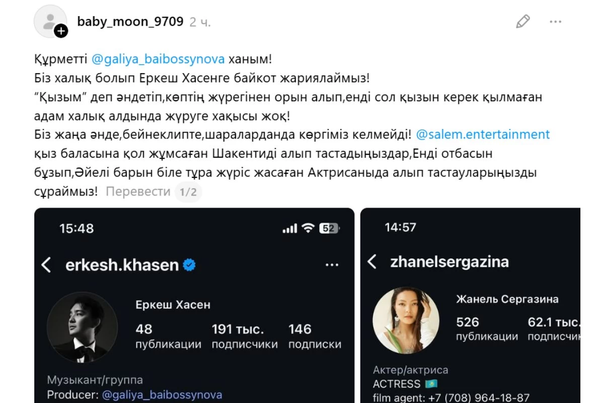 Құрметті, Ғалия Байбосынова ханым! Біз халық болып Еркеш Хасенге байкот жариялаймыз! “Қызым” деп әндетіп, көптің жүрегінен орын алып, енді сол қызын керек қылмаған адам халық алдында жүруге хақысы жоқ! Біз жаңа ән де, бейнебаян да, шаралардан да көргіміз келмейді! Сәлем social, отбасын бұзып, әйелі барын біле тұра жүріс жасаған актрисаныда алып тастауларыңызды сұраймыз!” – деп жазды ол.