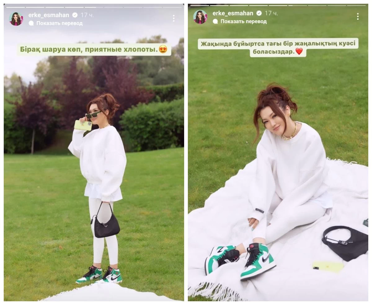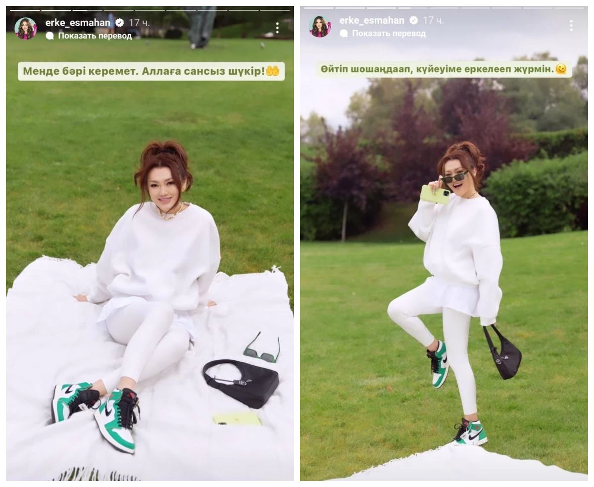 “Менде бәрі керемет. Аллаға шүкір! Өстіп шошаңдап, күйеуіме еркелеп жүрмін. Бірақ шаруа көп. Жақында бұйыртса тағы бір жаңалықтың куәгері боласыздар”, – деп жазды Ерке.