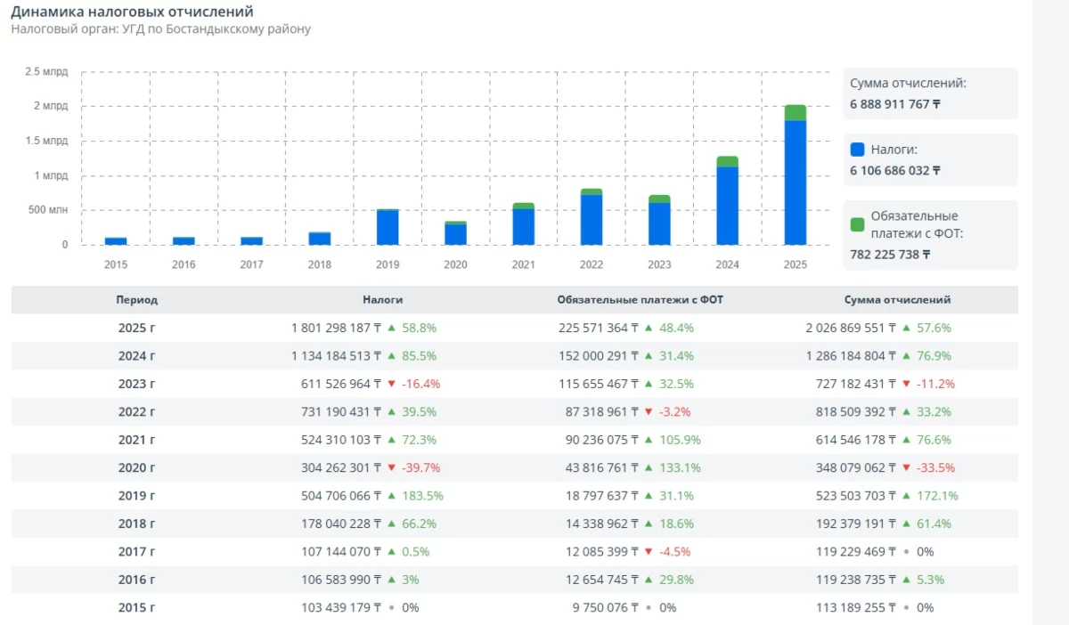 Мәліметтерге сенсек, компаниясы 2015 жылы 113 189 255 теңге салық төледі. 2016 жылы 119 238 735 теңге, 2017 жылы 119 229 469 теңге, 2018 жылы 192 379 191 теңге, 2019 жылы 523 503 703 теңге, 2020 жылы 348 079 062 теңге, 2021 жылы 614 546 178 теңге, 2022 жылы 818 509 392 теңге, 2023 жылы 727 182 431 теңге, 2024 жылы 1 286 184 804 теңге және 2025 жылы 2 026 869 551 теңге салық төледі.