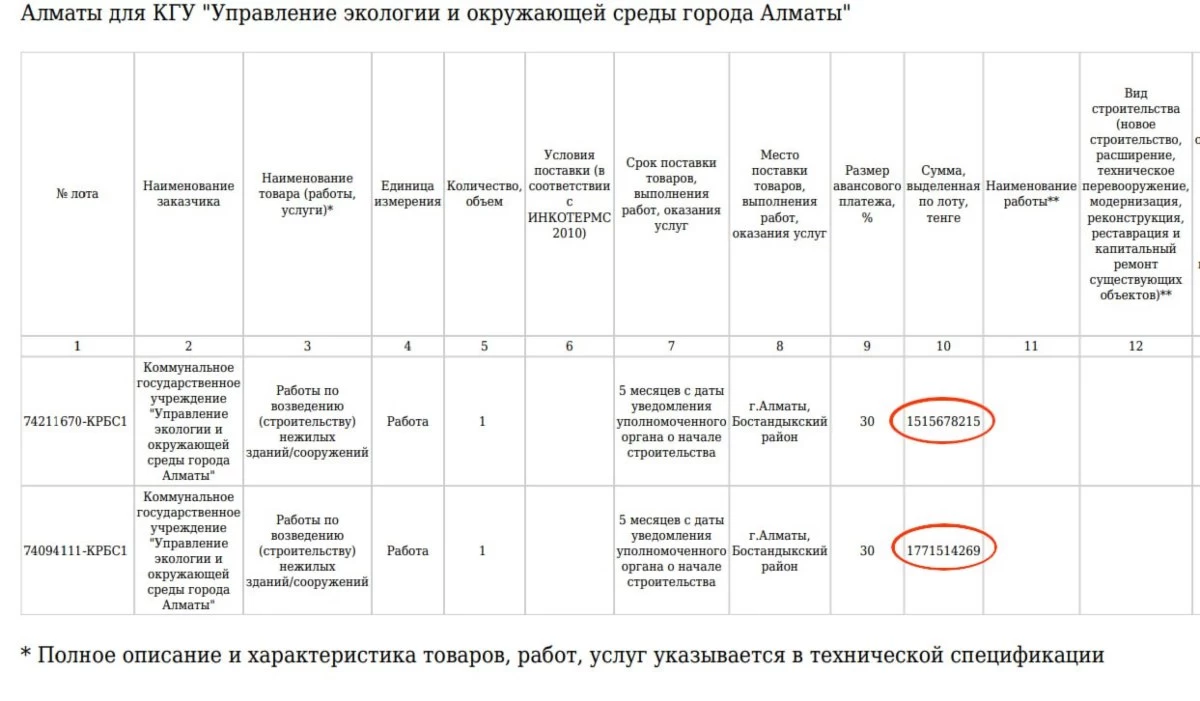 Тендер құжаттарына сәйкес, тек Алатау ауданында 17 контейнерге арналған жеті алаңның құрылысы 44,5 миллион теңгеге түсті. Оның ішінде 14,95 млн теңге құрылыс-монтаждық жұмыстарға, 21,366 миллион теңге жабдыққа, тағы 8,211 миллион теңге басқа шығындарға жұмсалған.