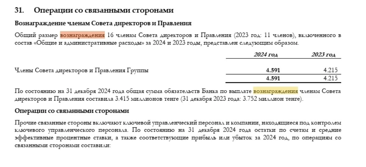 Өткен жылы 31 желтоқсанда банк директорлар кеңесі мен басқарма мүшелеріне төленетін сыйақы көлемі 3,4 миллиард теңге болған. 2023 жылмен салыстырғанда сыйақы мөлшерін 3,8 миллиард теңгедей алған. Дегенмен банктің қай мүшесінің қанша алғаны туралы мәлімет берілмеген.