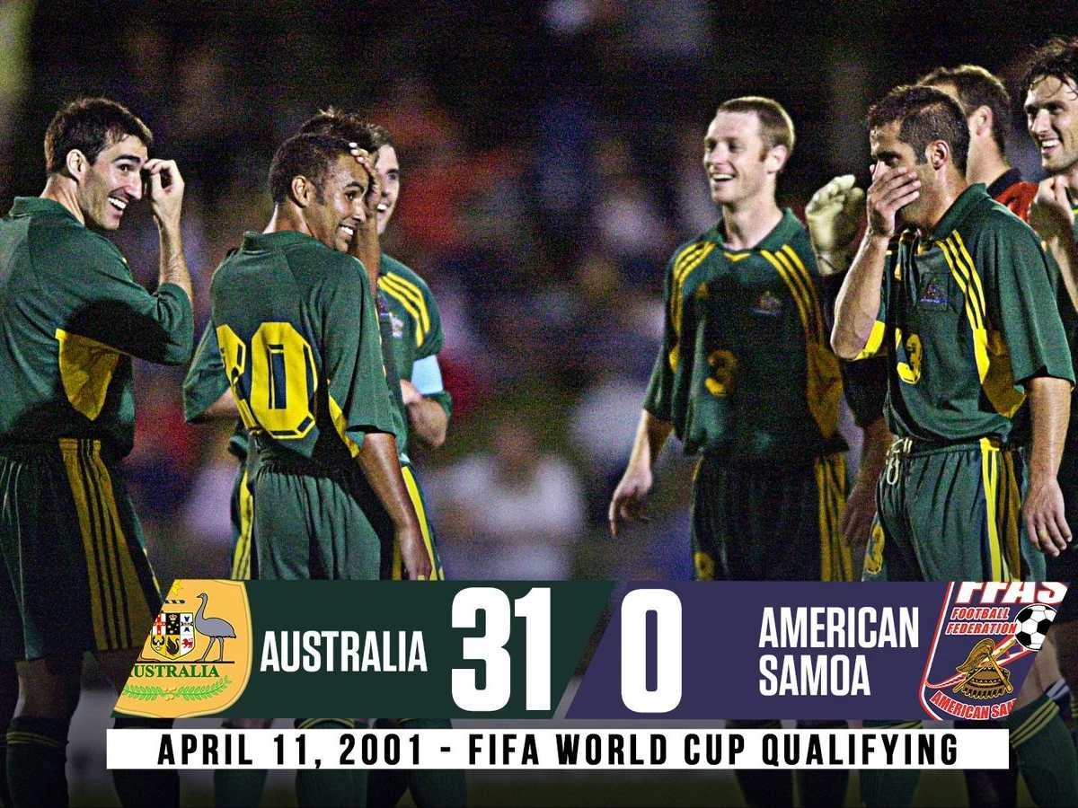 Футбол әлеміндегі ең ірі жеңістердің бірі 2001 жылы тіркелді. 2002 жылғы Әлем чемпионатының іріктеу кезеңінде Аустралия құрамасы америкалық Самоа командасын 31:0 есебімен ойсырата жеңді. Бұл – футбол тарихындағы ең ірі есеппен аяқталған ресми матч болып саналады.