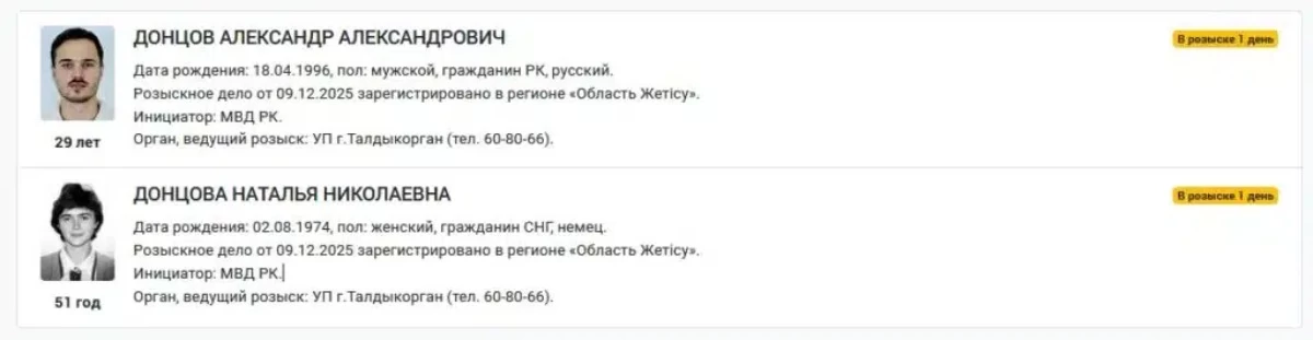 Министрлік Наталья Донцова мен оның ұлы Александр Донцовқа іздеу жариялады. Іс Жетісу облысында тіркелген.