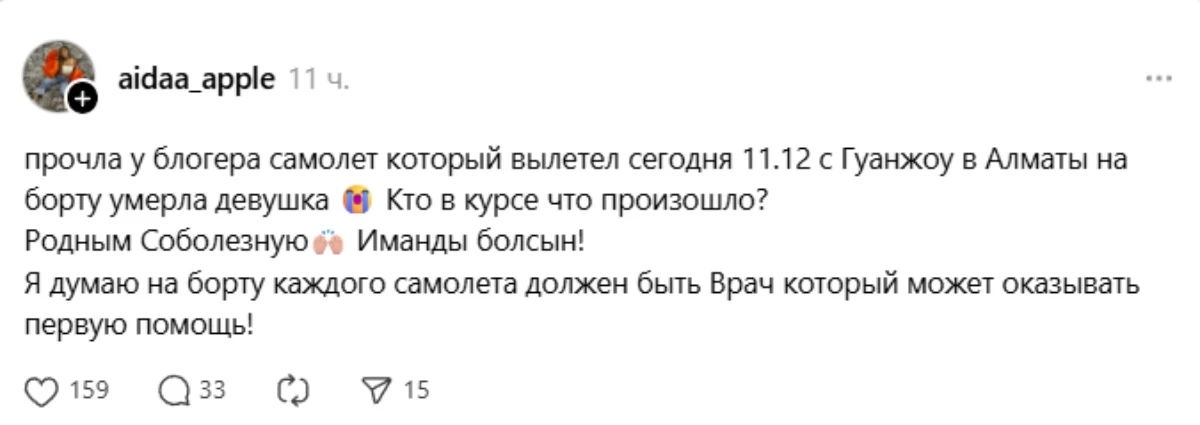 “11 желтоқсанда Гуанчжоудан Алматыға ұшқан ұшақ бортында әйел қайтыс болды. Менің ойымша, әрбір ұшақта алғашқы медициналық көмек көрсете алатын дәрігер болуы керек”, – деп жазды пайдаланушы.