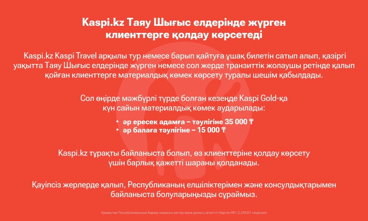 Kaspi.kz Kaspi Travel арқылы тур немесе барып қайтуға ұшақ билетін сатып алып, қазіргі уақытта Таяу Шығыс елдерінде жүрген немесе сол жерде транзиттік жолаушы ретінде қалып қойған клиенттерге материалдық көмек көрсету туралы шешім қабылдады.