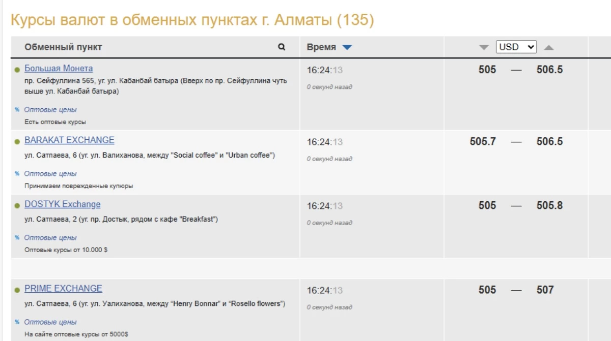 Kurs.kz порталының деректеріне сәйкес, ірі қалалардағы айырбастау пунктері қолма-қол доллар бойынша келесі сатып алу және сату бағаларын ұсынып отыр: